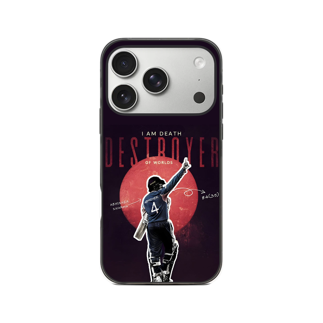 Witness the arrival of the new era of carnage. This design immortalizes Abhishek Sharma's explosive dominance, framing him against a blood-red moon with the haunting "I AM DEATH, DESTROYER OF WORLDS" typography. Featuring his signature stats—84(35)—it’s a cinematic tribute to the raw power and fearless intent that redefined T20 batting. For the fans who crave the chaos of a boundary-blitz, this is the ultimate statement.