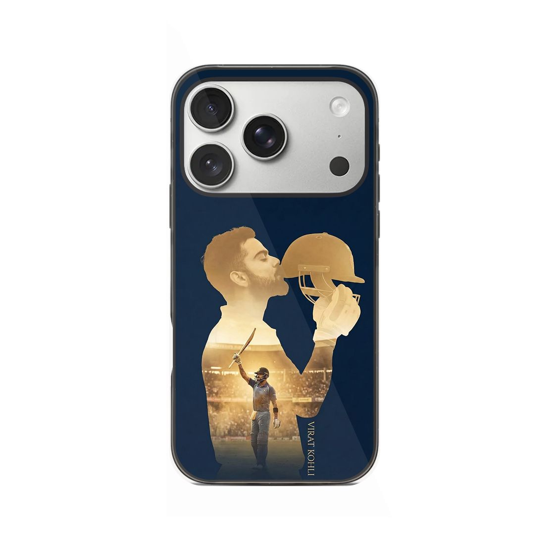 Dominate with double the King. This sophisticated case features a striking golden silhouette of Virat Kohli, depicting him in two iconic poses: kneeling in gratitude after a monumental century and triumphantly raising his bat. Set against a premium deep navy backdrop, it's a sleek, dual tribute to his passion and perfection.