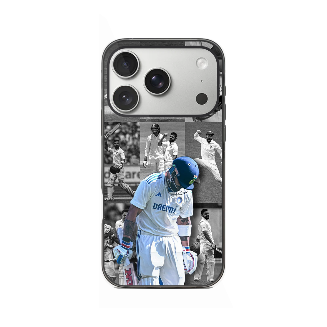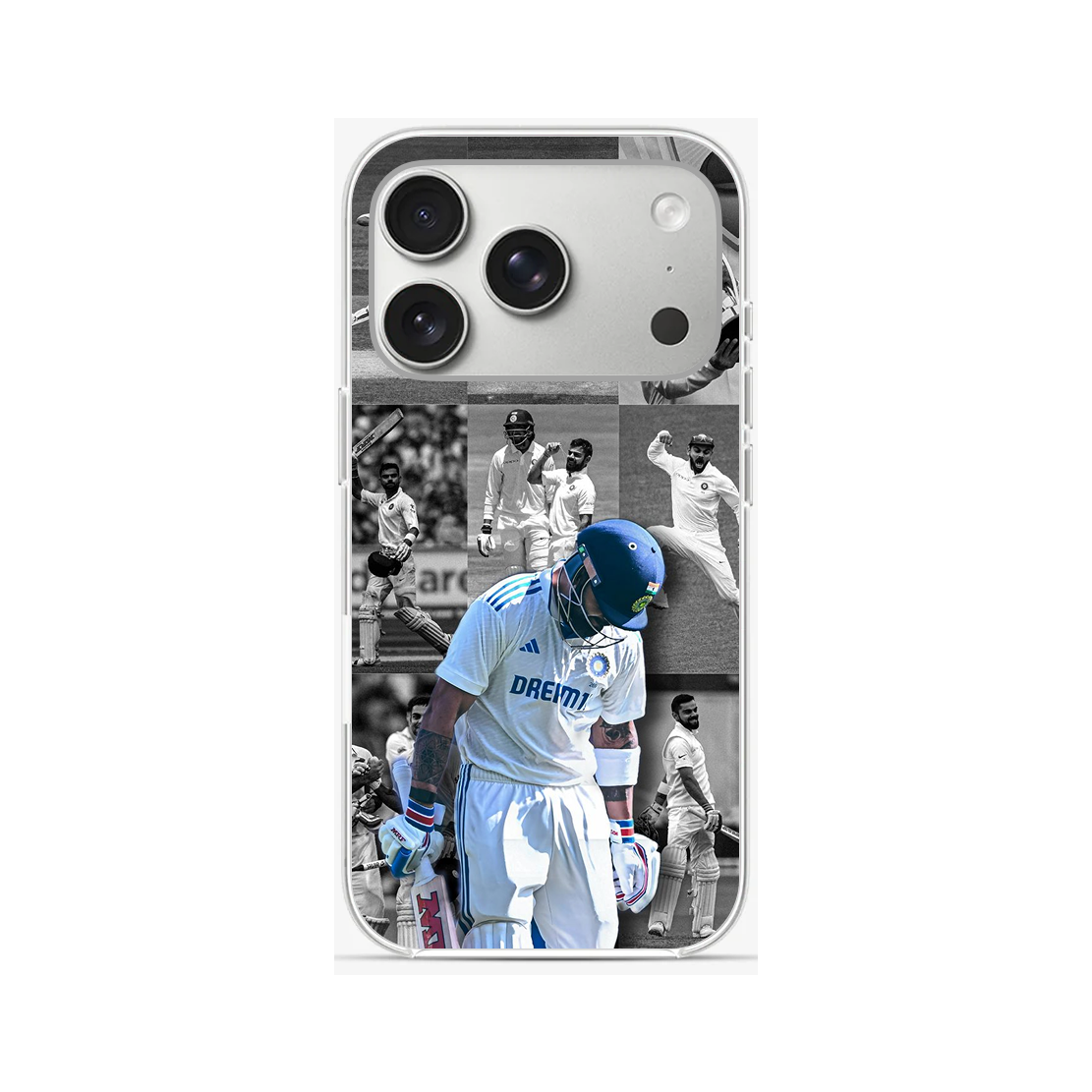 Experience the prestige of the longest format with this monochrome tribute. Featuring a high-definition central shot of Virat Kohli in his iconic whites, this design is layered over a cinematic black-and-white collage of his most legendary Test match moments. A sophisticated and timeless aesthetic for fans who appreciate the grit, discipline, and pure class of the King in red-ball cricket.