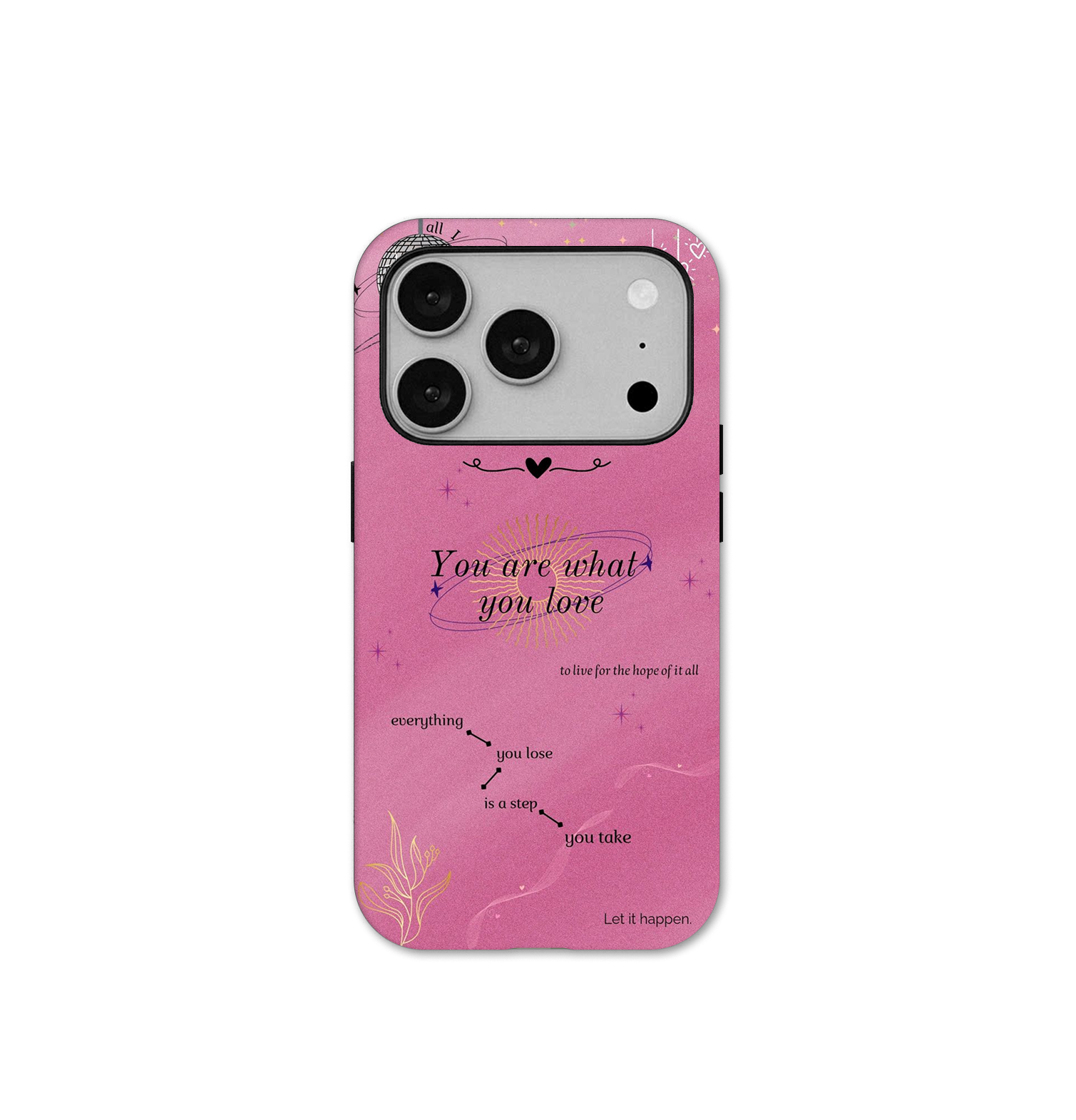 Wear your heart on your tech. This case features an ethereal pink celestial collage finished with a premium 3-layered glossy coat. The 360° all-side print ensures the intricate typography and cosmic details wrap seamlessly around every edge for a professional, continuous look.